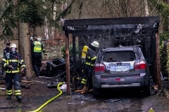 Bei unserem Eintreffen brannte bereits das Carport samt Schuppenanbau sowie der PKW in voller Ausdehnung. Umgehend wurde ein Löschangriff mit 2 C-Rohren vorgenommen. Zwei Gasflaschen, die im Schuppen gelagert waren, wurden geborgen und mit einem 3. C-Rohr gekühlt.